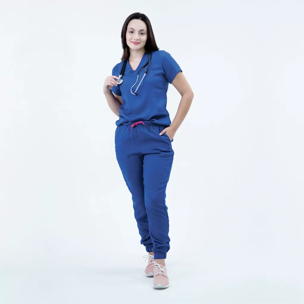 Calça estilo jogger (elástico no tornozelo) com ajuste de elástico na cintura, dois bolsos frontais e elástico no tornozelo.